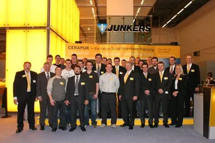 Junkers hat 50 Installateure, die gerade ihre Meisterprüfung abgelegt haben, zur Junkers-Meisterklasse nach Frankfurt auf die ISH eingeladen. Die jungen Meister erfuhren am Messestand viel Neues. Heute Abend wird noch gemeinsam gefeiert und morgen gibt es ein hochkarätiges Verkaufssschulungsseminar für die Gäste. Junkers zeigt damit, wie wichtig qualifizierte Ausbildung im Fachhandwerk ist.