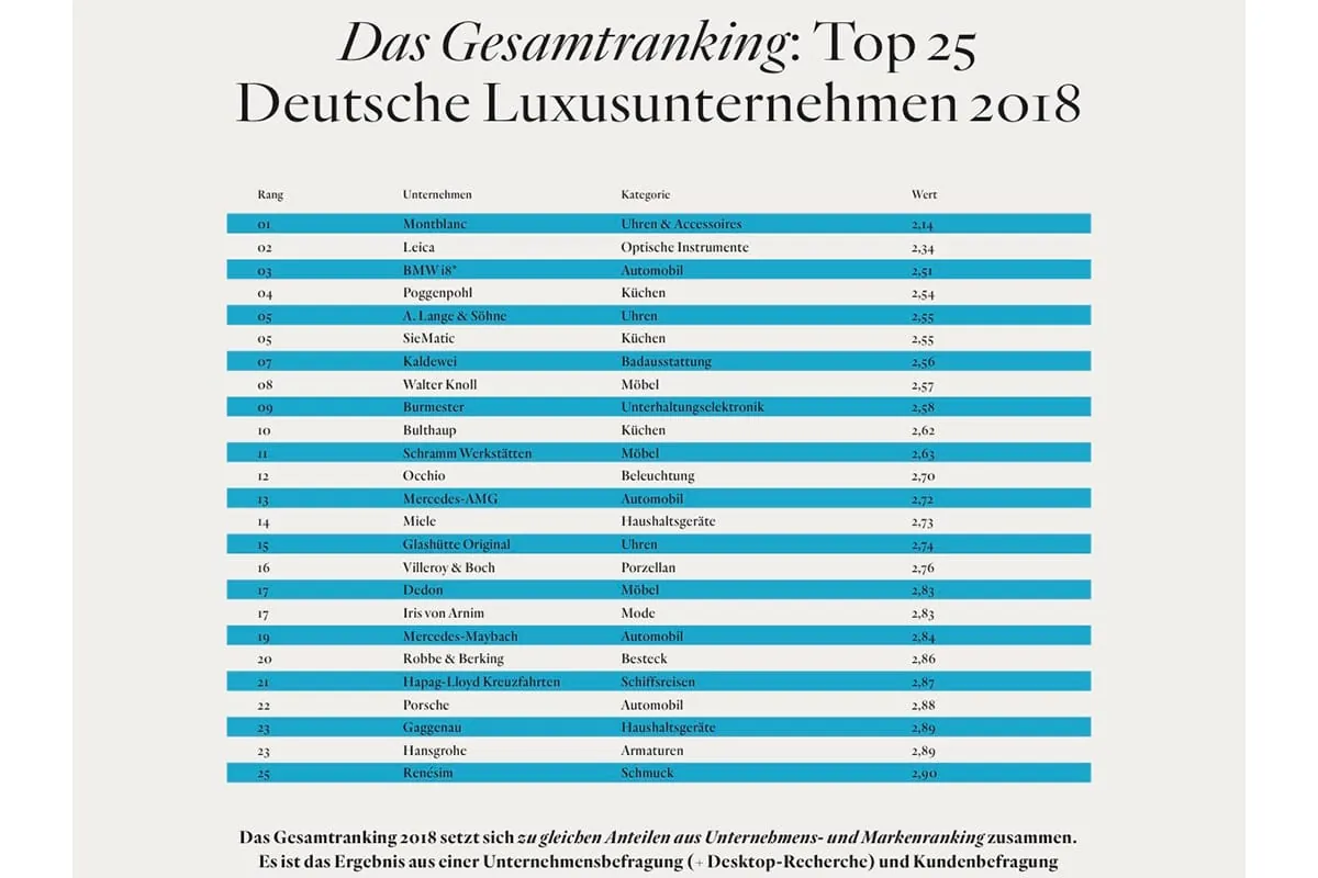 Neu in der Ermittlung des Rankings war die Untersuchung der Zukunftsfitness der Luxusmarkenhersteller durch die Subkategorien Digitalisierung, Innovation, Nachhaltigkeit sowie Kundenzentrierung. Zudem wurden erstmals über 1.000 Endkunden befragt, denn laut Keylens-Geschäftsführer Jörg Meurer mache erst die Kundenwahrnehmung eine Luxusmarke zu einer Top-Luxusmarke. Das Top-50-Ranking wurde Ende Juni auf der deutschen Fachkonferenz für den Luxus- und Premiumbereich, dem Luxury Business Day (LBD), in München vorgestellt. Die Unternehmensübersicht sowie alle Ergebnisse der Studie können im Luxury Business Report 2018 eingesehen werden.