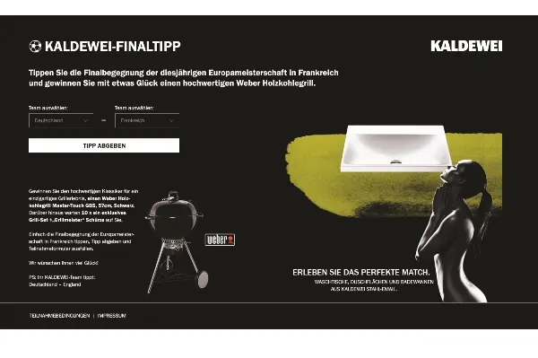 Ab sofort profitieren Sanitär-Fachhandwerker nicht nur bei ihrer täglichen Arbeit von ihrer Kompetenz und den optimalen Kombinationen der Kaldewei-Produkte. Sanitär-Profis können ihr Fußballwissen beweisen. Unter www.kaldewei-finaltipp.de einfach dieFinalbegegnung der Europameisterschaft tippen und mit etwas Glück einen hochwertigen Weber Holzkohlegrill Master-Touch GBS, ø 57 cm, Schwarz oder eines von 10 exklusiven Grill-Sets gewinnen.