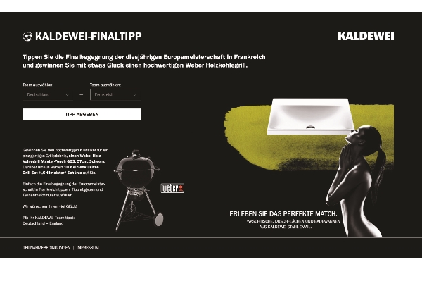 Ab sofort profitieren Sanitär-Fachhandwerker nicht nur bei ihrer täglichen Arbeit von ihrer Kompetenz und den optimalen Kombinationen der Kaldewei-Produkte. Sanitär-Profis können ihr Fußballwissen beweisen. Unter www.kaldewei-finaltipp.de einfach dieFinalbegegnung der Europameisterschaft tippen und mit etwas Glück einen hochwertigen Weber Holzkohlegrill Master-Touch GBS, ø 57 cm, Schwarz oder eines von 10 exklusiven Grill-Sets gewinnen.