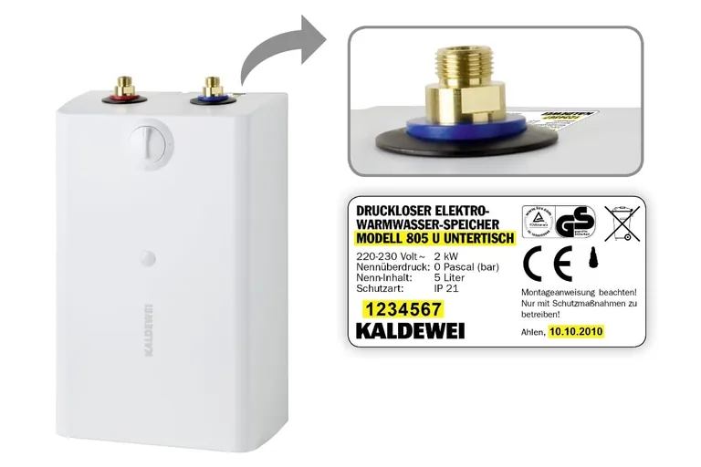 Zur Geräteidentifikation kann das Typenschild herangezogen werden. Es befindet sich auf der Oberseite des Gerätes neben den Anschlüssen für Kalt- und Warmwasser. Ausdrücklich nicht betroffen sind das Übertisch-Gerät „Modell 805“ und die Geräte der Vorgängergeneration mit der Modellnummer „705-U“. Für Rückfragen der Kunden hat Kaldewei eine Servicehotline mit der Rufnummer 0800 100 2354 (kostenfrei aus dem deutschen Festnetz) eingerichtet. Zudem erhalten Betroffene weitere Informationen unter www.Kaldewei-Elektro-Warmwasserspeicher-805-U.com.