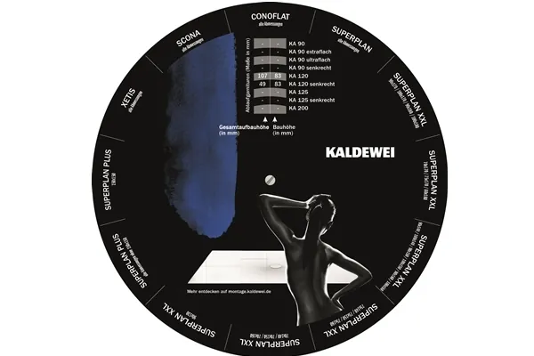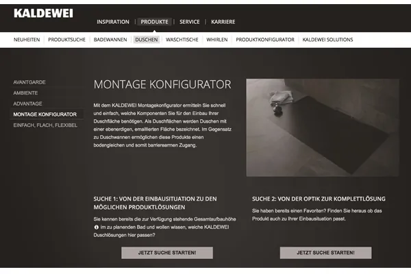 Mit dem Montagekonfigurator von Kaldewei gelingt die Badplanung so schnell und einfach wie noch nie – und die Anwendung ist kinderleicht. Ganz gleich, ob von der vorgegebenen Gesamtaufbauhöhe ausgegangen wird oder ob sich der Kunde zunächst für sein Wunschmodell einer emaillierten Duschfläche entscheidet: Mit nur wenigen Klicks ermittelt der Montagekonfigurator alle Lösungen und liefert dem Sanitärplaner eine komplette Produktübersicht mit Modellserie, verfügbaren Abmessungen, Montage- und Ablaufsystemen sowie weiteres Zubehör. Darüber hinaus macht er konkrete Angaben zur Bauhöhe und Gesamtaufbauhöhe für die gewählten Produkte. So gelingen jede Kundenberatung und Planung schnell, einfach und sicher.