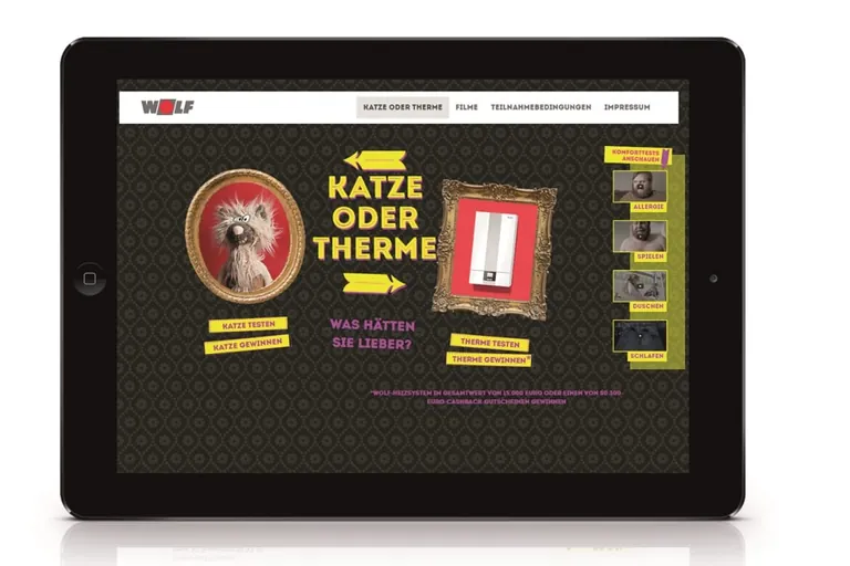 „Voll auf mich eingestellt“ heißt der neue Leitgedanke von Wolf. Für den Anbieter von Heizungs- und Klimasystemen ist dabei das optimale Raumklima laut eigenen Angaben mehr als nur Temperatur und Luftfeuchtigkeit: Es ist ein Stück Lebensqualität. Vermitteln soll diese neue Marketingbotschaft die virale Videokampagne „Katze oder Therme“.
