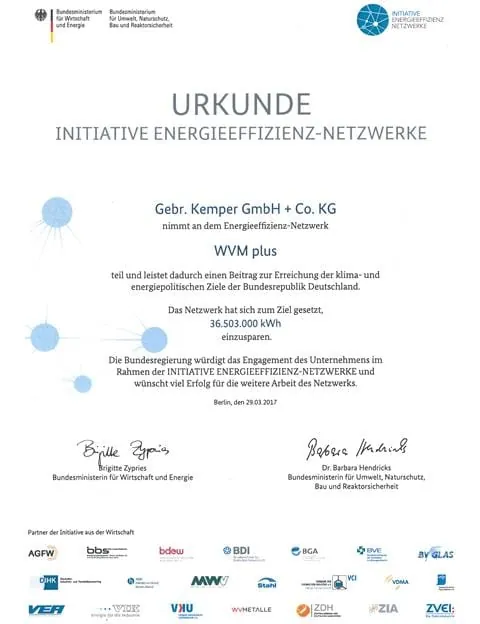Das Bundesministerium für Wirtschaft und Energie sowie das Bundesministerium für Umwelt, Naturschutz, Bau und Reaktorsicherheit haben die Teilnahme der Gebr. Kemper GmbH + Co. KG am Energieeffizienz-Netzwerk WVM plus urkundlich bestätigt.