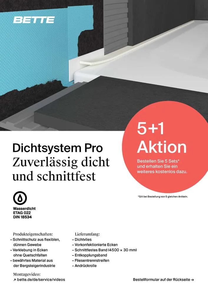 Mit dem neuen Dichtsystem Pro will Bette dem Sanitärhandwerk ein Rundum-Sorglos-Paket für die Abdichtung von Dusch- und Badewannen an die Hand geben. Eine 5 + 1-Gratis-Aktion des Unternehmens lädt nun bis Jahresende zum Kennenlernen des Sets ein.