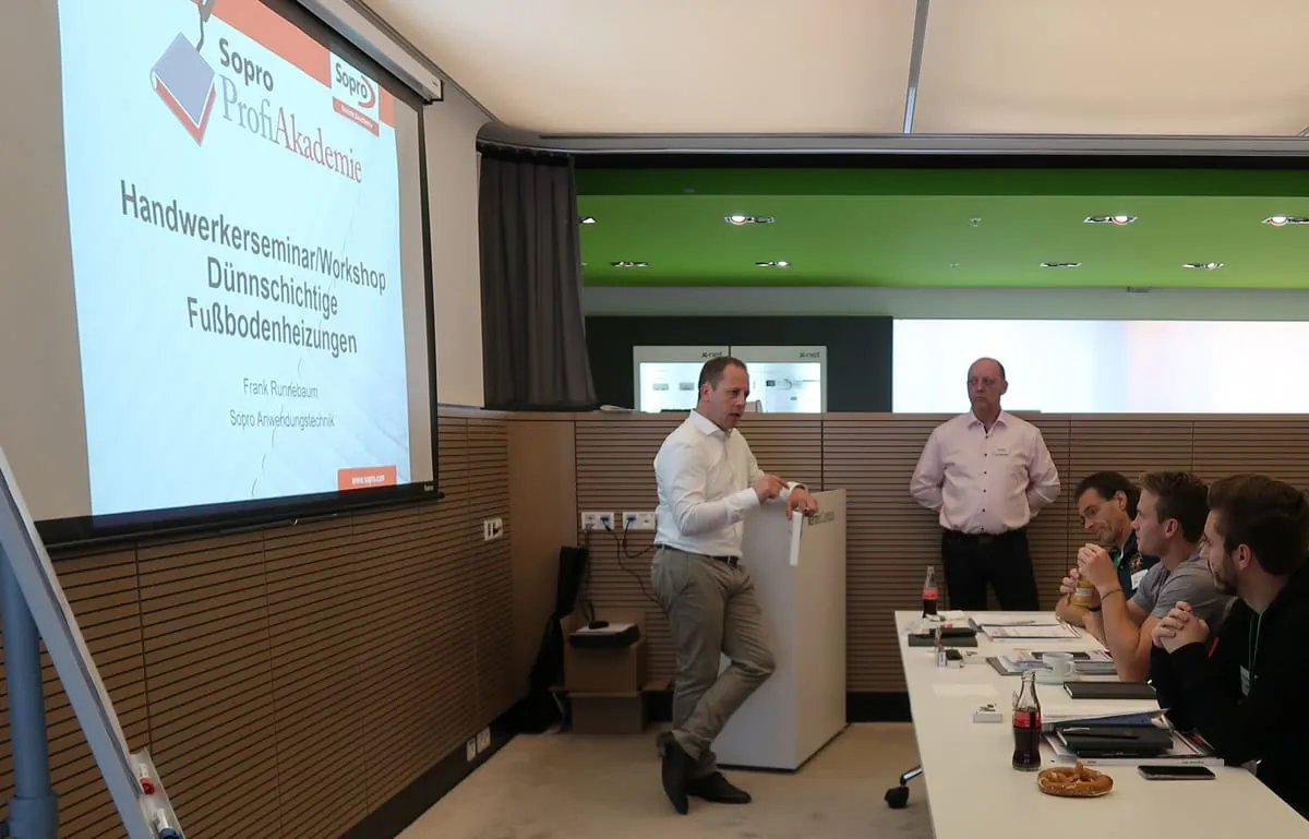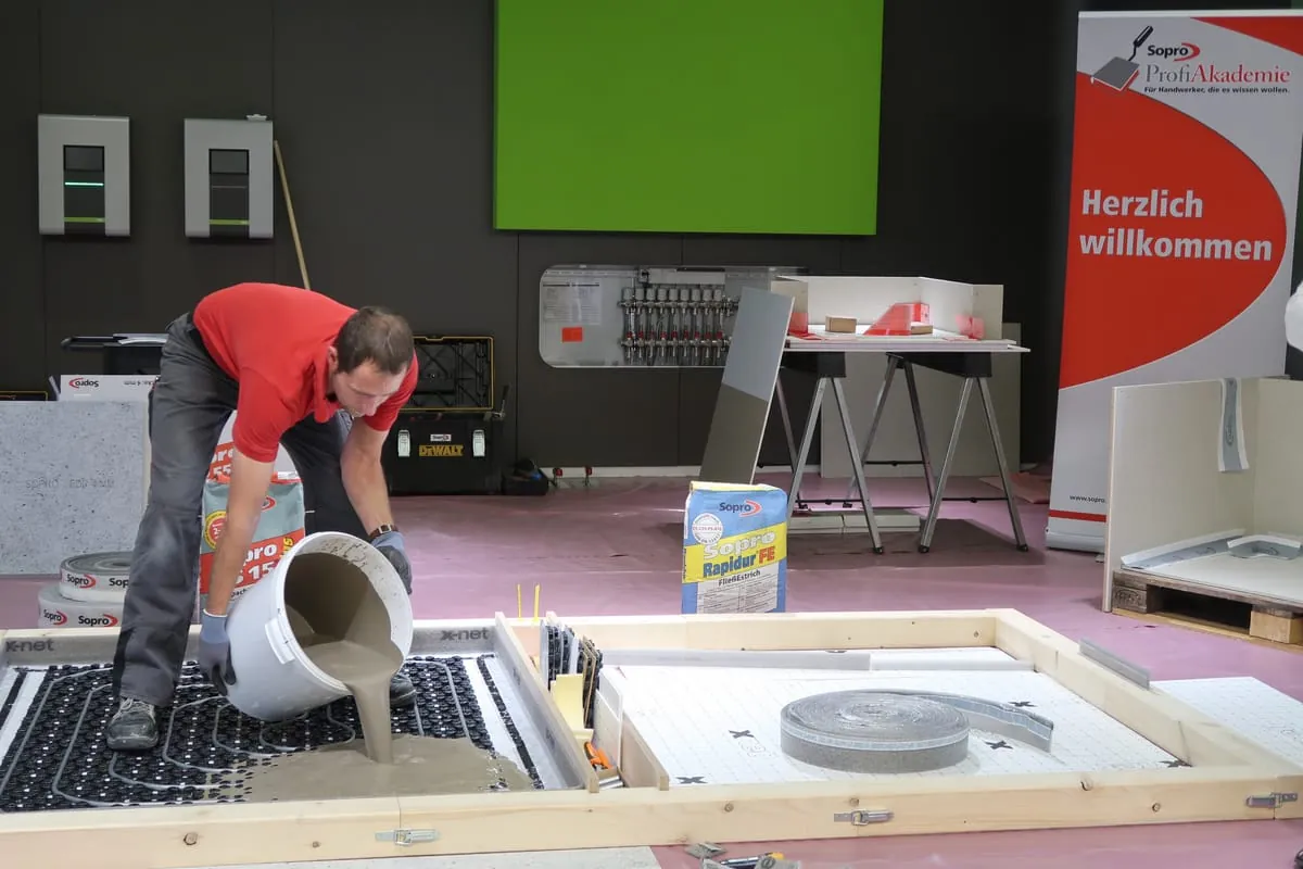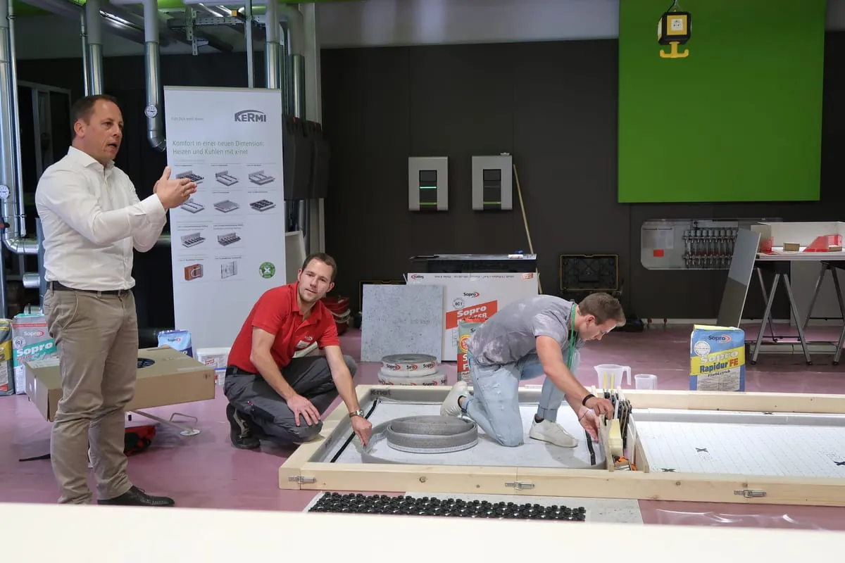 Im Seminarzentrum Kermi:Campus wird der Einbau der Produkte in Theorie und Praxis geschult. Bei einem Workshop in Kooperation mit der Sopro Bauchemie GmbH stand Anfang November das x-net C15 Dünnschichtsystem im Fokus.