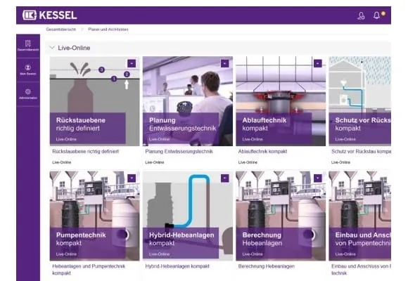 Unter dem Menüpunkt Weiterbildung können Architekten/Planer, Verarbeiter, Behörden, Händler und Betreiber/Entsorger nun zielgruppenorientiert durch eine übersichtlich gestaltete Auswahl- und Filterfunktion das für sie passende Präsenzseminar oder Webinar buchen. Über die Selektion der Anwendergruppe und das gewünschte Lernformat im neuen Kessel-Seminarkatalog lassen sich Qualifizierungen aus insgesamt 24 Themen rund um die Entwässerungstechnik wählen.