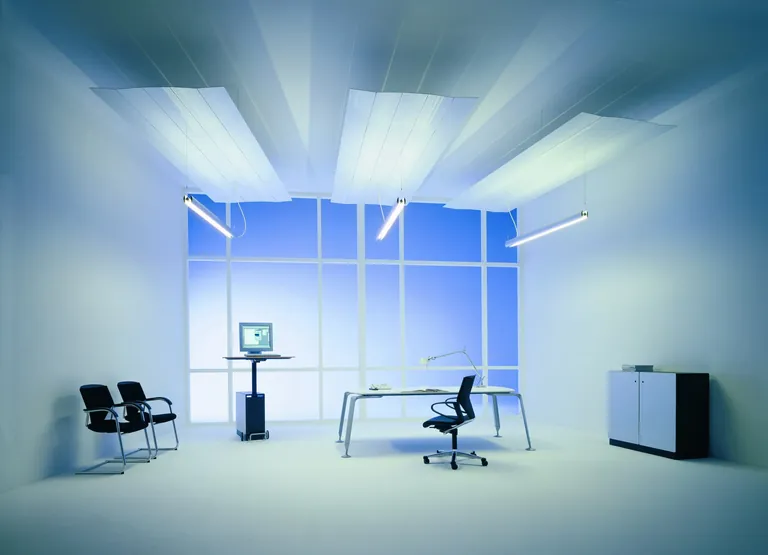 Die Zuluft wird bei der Verteilung angenehm erwärmt oder gekühlt. Das Temperieren erfolgt vorrangig durch Strahlung, die aus der Temperaturdifferenz zwischen den einzelnen Flächen im Raum, Menschen und Gegenständen entsteht: Um diesen Strahlungsaustausch noch zu intensivieren und die Wärme oder Kühle weithin spürbar zu machen, ist die Oberfläche des Klimasegels sanft gewellt. Die optionalen Ventilatoren in der Plus-Variante verkürzen zudem die Aufheizphasen; zugleich ermöglichen sie, insbesondere im Kühlbetrieb, eine effektive Nachregulierung zu Spitzenlastzeiten – eine extra Leistungssteigerung.