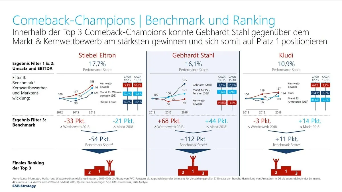 3.287 Unternehmen der deutschen Bauindustrie hat die Unternehmensberatung S&B Strategy GmbH mit Sitz in München untersucht. Dabei haben die unter anderem auf die Baubranche spezialisierten Berater die Firmen identifiziert, die es nach einer Phase stagnierender bzw. rückläufiger Umsätze in den letzten Jahren geschafft haben, Geschäftsvolumen und Ertrag wieder zu steigern. Zu diesen „Comeback Champions“ gehört – so ein Ergebnis der Studie – auch die Kludi GmbH & Co KG mit Stammsitz in Menden. In dem unlängst veröffentlichten Ranking der Firmen der deutschen Bauindustrie, denen zwischen 2012 und 2018 beim Umsatz der Turnaround ohne Ertragseinbußen gelungen ist, belegt der Armaturenspezialist aus dem Sauerland den zweiten Platz. Zu dieser Spitzenposition hat beigetragen, dass Kludi im untersuchten Zeitraum sowohl gegenüber dem Markt als auch im Vergleich zum Kernwettbewerb besonders stark zulegen konnte: Während der Umsatz des Mendener Familienunternehmens in den Jahren 2016 bis 2018 im Durchschnitt pro Jahr um mehr als 8% gewachsen ist, liegt nach den Daten von S&B Strategy das Plus für den Ar-maturenmarkt in Deutschland bei 3,7%, das für den Kernwettbewerb bei 2,2%.