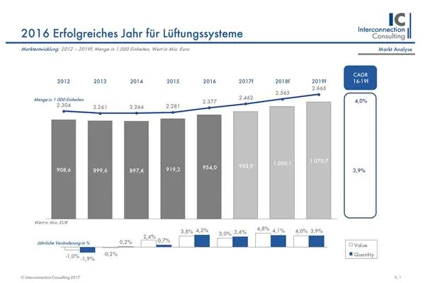Der Markt für kontrollierte Wohnraumlüftung in Europa hat 2017 in Menge um 4,2% gegenüber dem Vorjahr zugelegt. Aufgrund der positiven Entwicklung im Bausektor wird auch in den kommenden Jahren mit einem Anstieg gerechnet. Bis 2019 soll sich das Marktvolumen des Sektors um durchschnittlich 3,9 % erhöhen, wie eine aktuelle Studie von Interconnection Consulting zeigt.