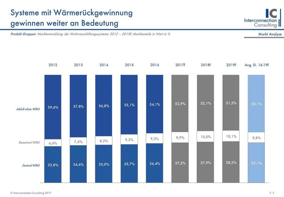 Nirgendwo ist die Menge an Wärmerückgewinnungssystemen in den vergangenen Jahren so gestiegen, wie in Deutschland. Dabei profitiert der deutsche Markt vom günstigen Bauumfeld. Zwischen 2012 und 2016 stieg die Anzahl der Wärmerückgewinnungssysteme um 58,4 %. Vor allem dezentrale Systeme mit Wärmerückgewinnung werden in Deutschland immer stärker nachgefragt. Der Marktanteil dieses Segments ist zwischen 2012 und 2016 von 16,9 % auf 24,8 % angestiegen. Deutschland ist auch der einzige Teilmarkt, wo die dezentralen Wärmerückgewinnungssysteme einen größeren Marktanteil verbuchen als die Zentralen (50,1:49,9).