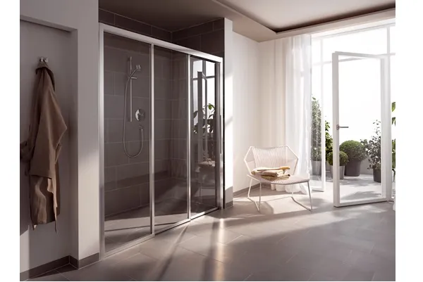 Die Duschabtrennung ist in drei Varianten als Eckdusche mit dreiteiligen Türen oder als dreiteilige Abtrennung für den Einbau in Nischen bzw. für die Kombination mit Trennwänden erhältlich. Die barrierefreie Eckdusche kann in den Breiten 1.200 x 1.200 mm bis hin zu rollstuhlgerechten 1.500 x 1.500 mm bei einer Standardhöhe von 2.000 mm geordert werden. Mit der Schiebetür für Nischen lassen sich 1.400 bis 1.800 mm breite Duschplätze realisieren.