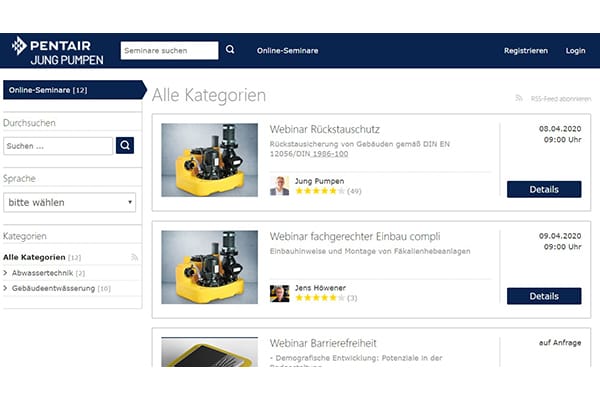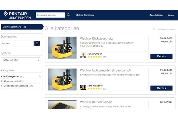 Ab sofort können die Webinare über die Jung Pumpen-Onlineakademie abgerufen werden. Hier findet man das Angebot. Individuelle Termine mit einzelnen Firmen können ebenso abgesprochen werden. Hierzu ist das Seminarteam telefonisch unter 05204/17-162 erreichbar oder per Mail an forum.jungpumpen@pentair.com.