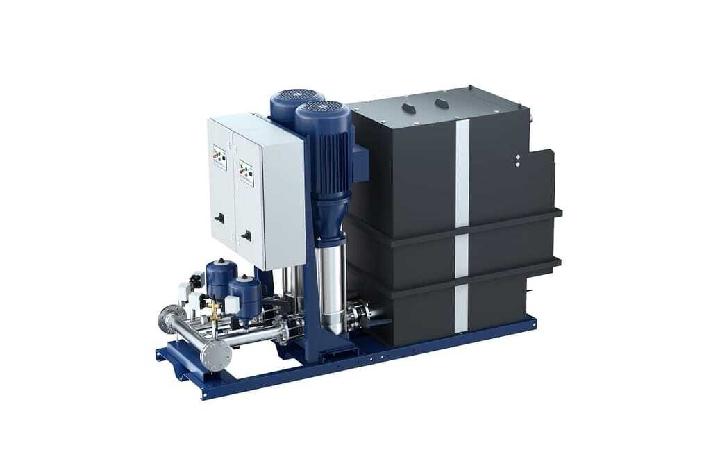 Das Nutzvolumen des Durchflussbehälters beträgt jetzt 600 l, um eventuelle Schwankungen der Zulaufmengen auszugleichen und die Pumpen auf jeden Fall für eine Minute mit Wasser zu versorgen. Neu gestaltete Ansaugkrümmer gestatten es, das Volumen des Behälters voll auszunutzen. Ein Kugelhahn am Boden des Behälters ermöglicht dem Betreiber regelmäßig die Funktion der Wassernachspeisung zu überprüfen. Ein Fenster als optische Füllstandsanzeige gibt jederzeit Aufschluss über den Wasserstand.