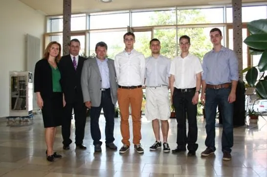 Marlene Waltl von Hansa; Alexander Görbing von Grünbeck und Andreas Bieber von HSK gratulierten den erfolgreichen Sitpendiaten Benedikt Wehner, Dirk Bublitz, Christian Klappschmidt und Daniel Bühner (von links)
