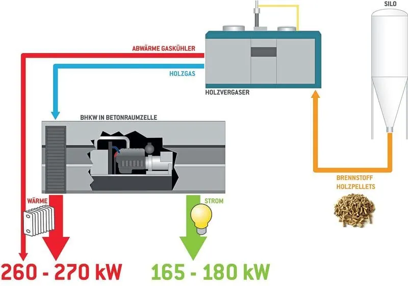 Holzpellet-BHKW können einen Gesamtwirkungsgrad von über 80 % erreichen. Für diese hervorragende Energieausbeute werden die Pellets zuerst im Vergasungsreaktor getrocknet und zu Holzgas umgewandelt. Anschließend wird das Holzgas gereinigt. Denn die Herausforderung für einen sicheren Betrieb des Gasmotors ist eine gleichbleibend gute Qualität und stabile Belieferung mit Holzgas. Die Bewegungsenergie des Gasmotors wird im Generator zu Strom umgewandelt. Die bei der Verbrennung im Motor freigesetzte Abwärme wird zur Deckung des Wärmebedarfs genutzt.