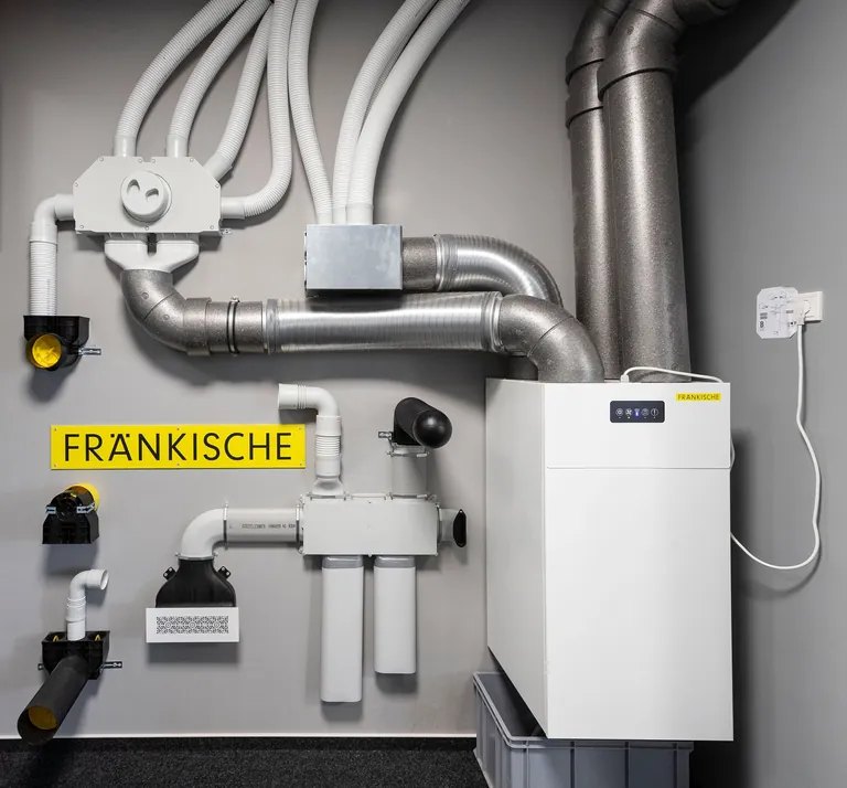 Im Schulungsraum befindet sich deshalb das Lüftungsgerät „profi-air 250 flex“ – zur Demonstration und zur tatsächlichen Be- und Entlüftung. Außerdem zeigt Fränkische kombinierbare Rohre, Verteiler und Verbindungselemente.