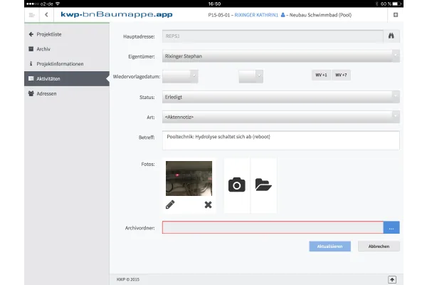 Mit der kwp-bnBaumappe.app wird alles, was der Handwerker vor Ort beim Kunden an Daten erfasst, kundenspezifisch und strukturiert direkt und automatisch im KWP-Archiv eingeordnet – ohne zeitraubende Doppelerfassung. Über die App hat der Monteur jederzeit Einblick auf die Fotonotizen aus der Baustellenbesichtigung und kann kritische Punkte erkennen. Durch die automatische Synchronisation verfügen alle über denselben Datenbestand.