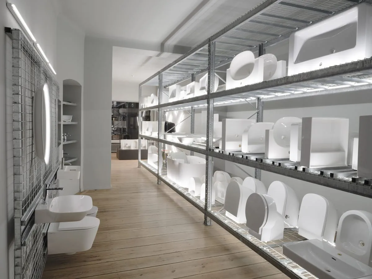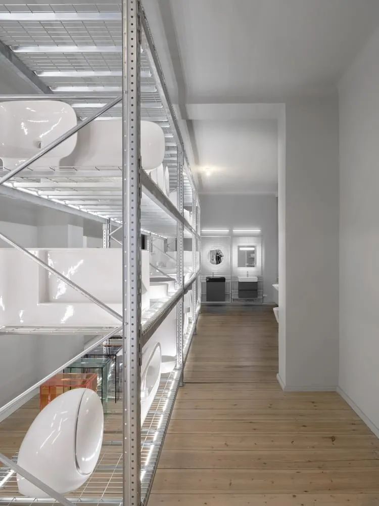 Die physische und haptische Vermittlung der Produkte des Badherstellers bleibt ein entscheidender Auftrag des Laufen space. Dritter Bereich ist deshalb das sogenannte Archiv, das für die spielerische Lust am Experimentieren steht. Hier findet sich eine große Auswahl an Badobjekten von Laufen in einem übergroßen Industrieregal versammelt. Die Objekte können mittels Wandkonstruktionen – den Racks – schnell und flexibel probeweise montiert werden, so dass sie in ihrer Anwendung im Raum erfahrbar werden. Hier lassen sich die Produkte, die auf dem Regal gelagert werden, fast spielerisch ein- und aushängen. Waschtische und WCs können je nach Gestaltungsidee beliebig kombiniert werden und bieten Handwerk, Handel und ihren Kunden nie dagewesene Möglichkeiten zur Bemusterung. Auch die hauseigenen Laufen-Armaturenkollektionen haben in diesem Spiel ihre Rolle und können ebenfalls durch einfaches Ein- und Ausstecken gewechselt werden. So können direkt Farben, Oberflächen und Designs miteinander verglichen und zusammengestellt werden. Das modulare System ermöglicht ein spontanes, praxisorientiertes Experimentieren, Anfassen, Berühren und Betrachten der Objekte, was nicht zuletzt die Beratung der hochwertigen Badausstattung erleichtert.