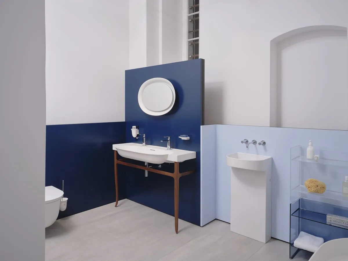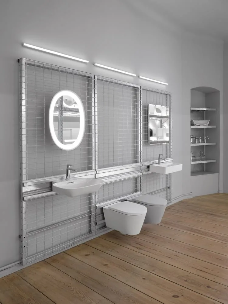 Geprägt ist der Raum in Berlin von der Handschrift des Designers Konstantin Grcic, mit dem Laufen eine lange gemeinsame Zusammenarbeit auf Ebene des Produktdesigns verbindet. Als einer der ersten entwickelte Grcic eine Kollektion mit Laufens Materialinnovation SaphirKeramik. Aus dem Experiment von damals ist mit VAL inzwischen eine der erfolgreichsten und umfangreichsten Gesamtbad-Kollektionen des Herstellers entstanden. Geblieben ist in der Zusammenarbeit von Unternehmen und Designer der beständige Wille und Mut zur Innovation und Weiterentwicklung.