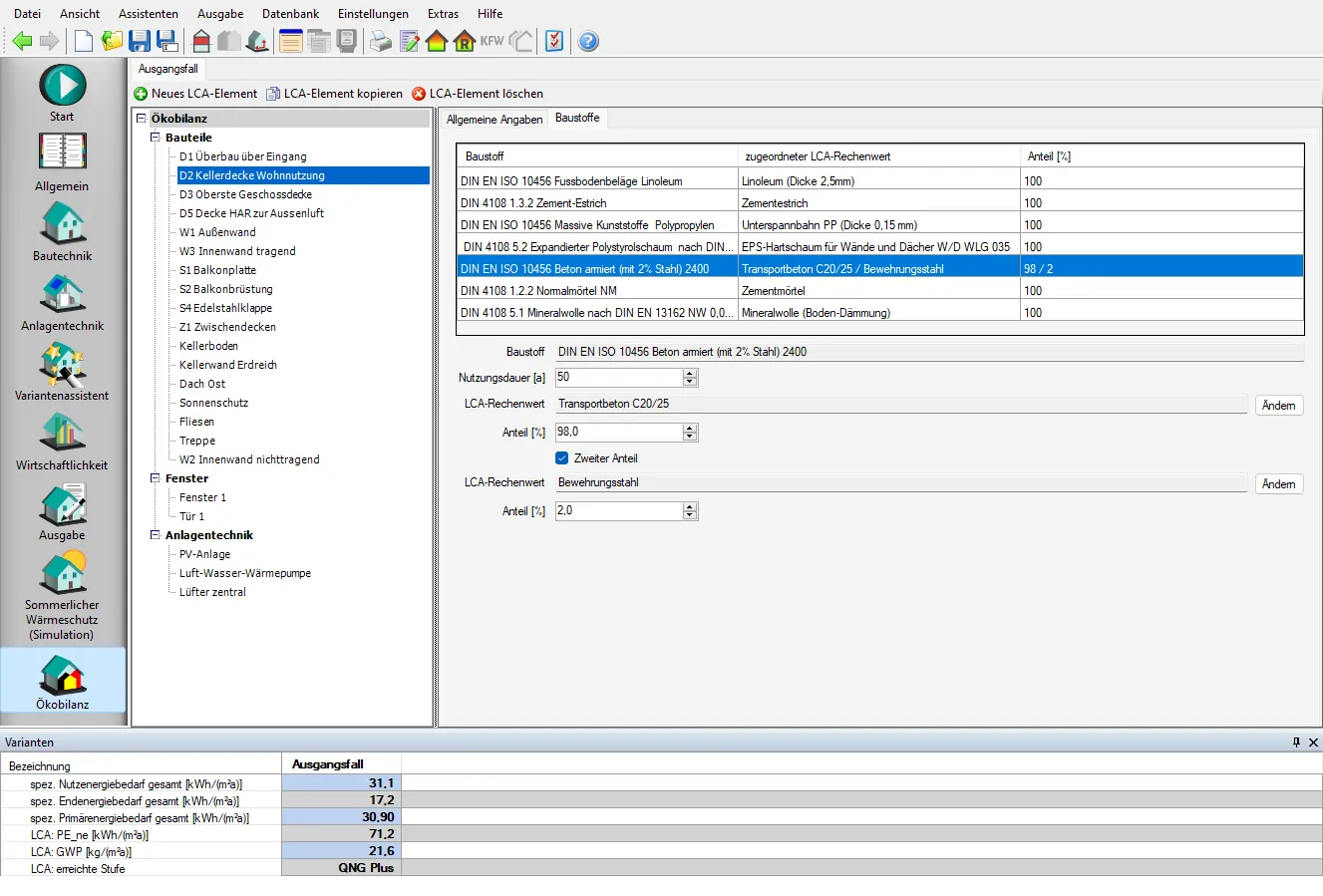 ZUB Helena Ökobilanz kommt deswegen als Erweiterungsmodul zum Hauptprogramm ZUB Helena auf den Markt. Das hat den Vorteil, dass die bereits für die energetische Förderung eingegebenen Daten sofort für die Lebenszyklusanalyse verwendet werden können. So lassen sich die Daten für Konstruktionen mit Schichtaufbau oder anlagentechnische Komponenten der entsprechenden Rechenwert-Tabelle schnell zuordnen.