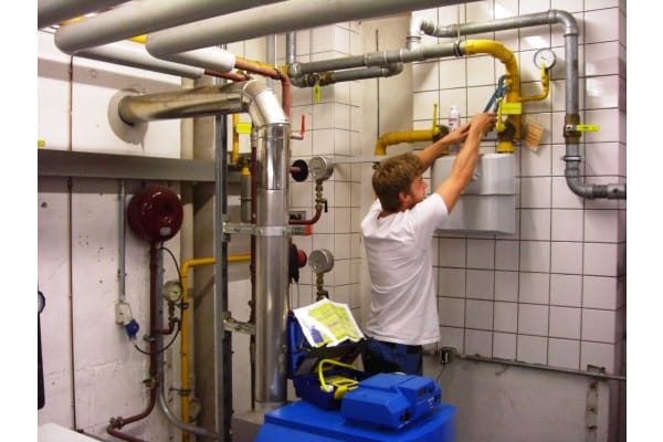 Anlagenmechaniker SHK bei der Gebrauchsfähigkeitsermittlung mit Leckmengenmessung an einer in Betrieb befindlichen Gasanlage. – © Bildungsakademie der Handwerkskammer Ulm