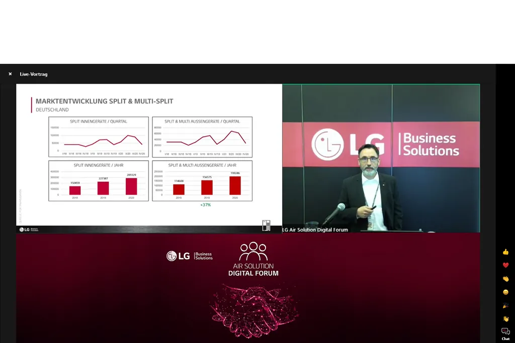 Der Unternehmensbereich Air Solution (AS) von LG Electronics hat am Dienstag, 30. März 2021, zum ersten „Air Solution Digital Forum“ eingeladen. Fast 200 Personen nahmen zwischen 14.00 Uhr und 17.30 Uhr an der virtuellen Veranstaltung teil, lernten Highlights aus dem AS-Portfolio kennen und tauschten sich mit den Produktexperten aus.