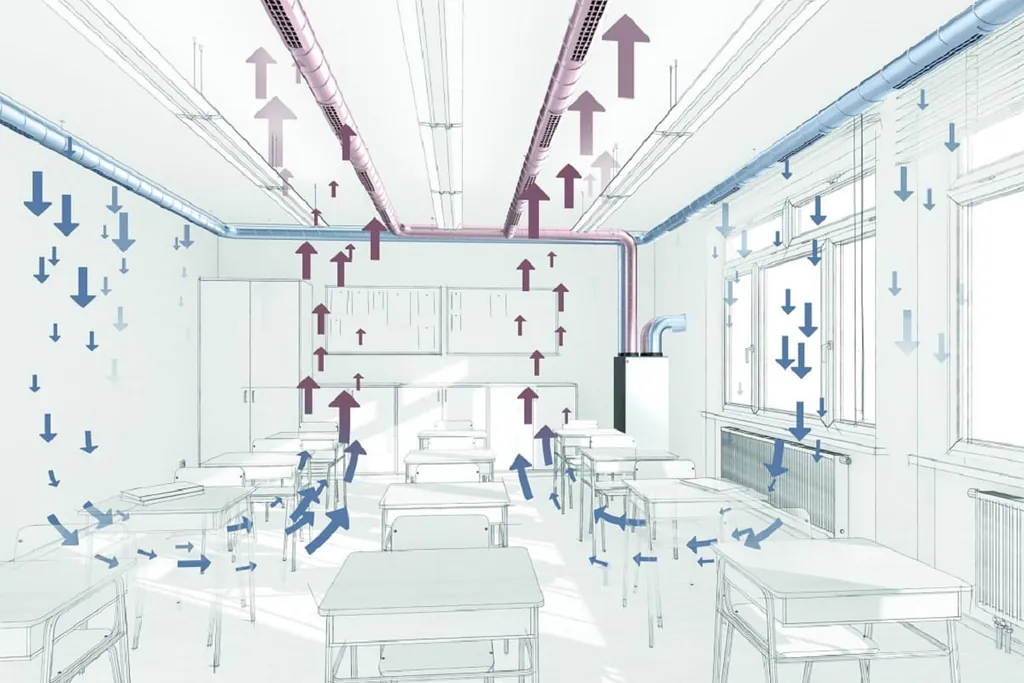 Dimplex empfiehlt für den schulischen Einsatz ein Lüftungssystem, dessen Be- und Entlüftungsrohre an der Decke des Klassenzimmers installiert werden. Die verbrauchte Luft wird direkt oberhalb der Schülerinnen und Schüler abgesaugt, so dass sie möglichst wenig Kontakt mit der belasteten Abluft haben. Sie wird über zwei Abluftstränge an der Zimmerdecke nach oben gesaugt und ins Freie geblasen. Im Gegenzug wird Frischluft an den beiden Seitenwänden zugeführt, so dass sich eine gerichtete, sanfte Luftströmung von den Seitenwänden zur Decke ergibt.