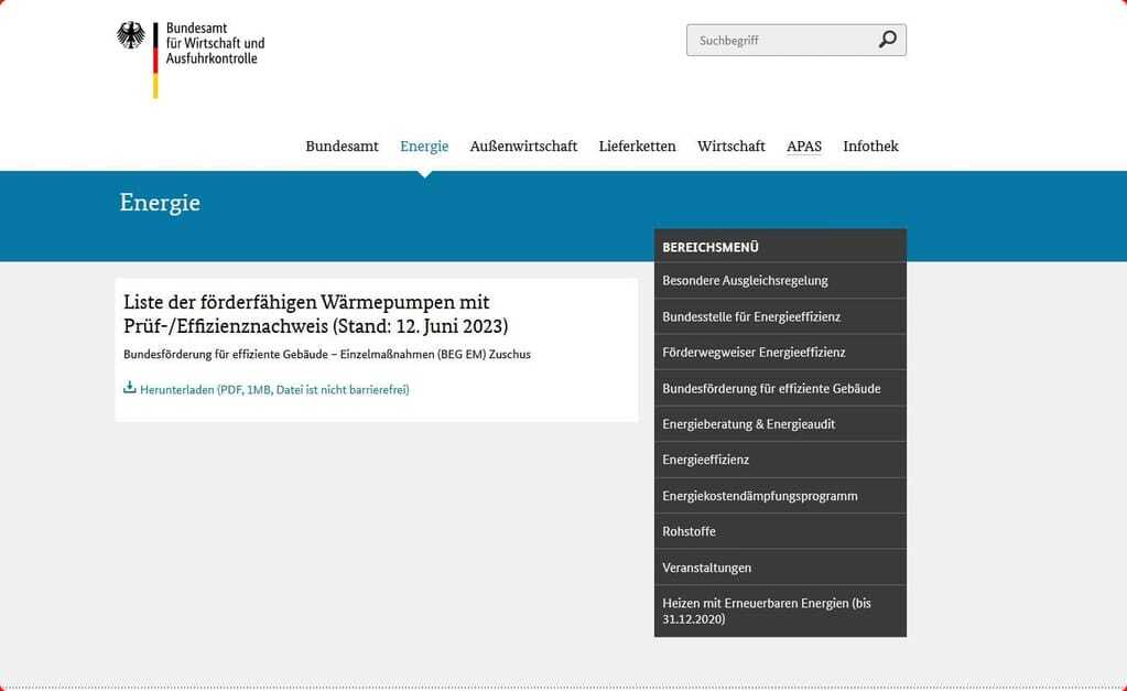 In erneuten Gesprächen zwischen dem Bundesamt für Wirtschaft und Ausfuhrkontrolle (BAFA), dem Bundesministerium für Wirtschaft und Klimaschutz (BMWK) und dem Fachverband Gebäude-Klima e. V. (FGK) konnte eine Vereinfachung erzielt werden, sodass die Liste der förderfähigen Wärmepumpen mit Prüf‑/Effizienznachweis (Stand: 12. Juni 2023) unter www.bafa.de wieder eine Auswahl dieser energieeffizienten Geräte enthält.