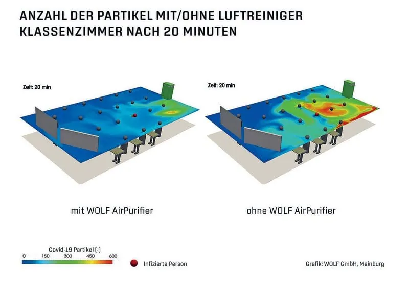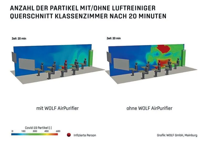 In Klassenzimmern gilt die Regel, alle 20 Minuten für 5 Minuten stoß- oder querzulüften. Da die baulichen Gegebenheiten dies nicht überall in ausreichendem Maße ermöglichen, stehen diverse Luftreiniger am Markt zur Verfügung, um die Fensterlüftung sinnvoll zu ergänzen. Eine neue Studie des Steinbeis-Forschungszentrums Virtual Testing hat nun die Effekte auf die Aerosolkonzentration in einem Klassenraum simuliert und zusätzlich anhand von Vor-Ort-Messungen eines im Einsatz befindlichen professionellen Geräts der Wolf GmbH validiert.