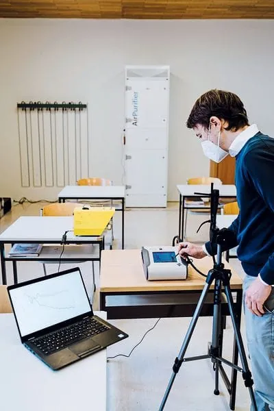 Die Messung fand sowohl unter realen Bedingungen während sechs Schulstunden als auch abseits des Schulbetriebs durch die gleichmäßige Verteilung eines Prüfaerosols statt. In dem 64 m² großen Raum wurde die zeitliche Entwicklung der Partikelanzahl mit einem optischen Aerosolspektrometer an sechs ausgewählten Messpunkten im Klassenzimmer beobachtet. Sowohl unter Realbedingungen als auch unter Prüfbedin-gungen mit Testaerosol zeigte sich, dass bei geschlossenen Fenstern die Konzentration an allen Messpunkten deutlich zurückging. Der durchschnittlich gemessene Abfall der Partikelanzahl des Prüfaerosols um 80 % innerhalb von 30 Minuten konnte eindeutig auf die Wirkung des AirPurifiers zurückgeführt werden. Die Messungen decken sich mit den Ergebnissen der Simulation. Der AirPurifier wurde mit einem Volumenstrom von 1.200 m³/h betrieben, wo-mit die Luft in Räumen dieser Größenordnung effektiv gefiltert werden kann.