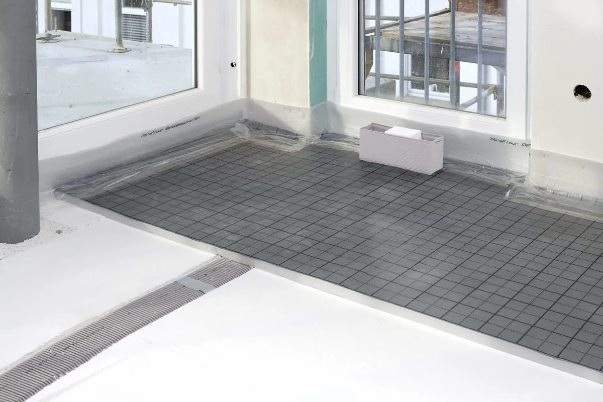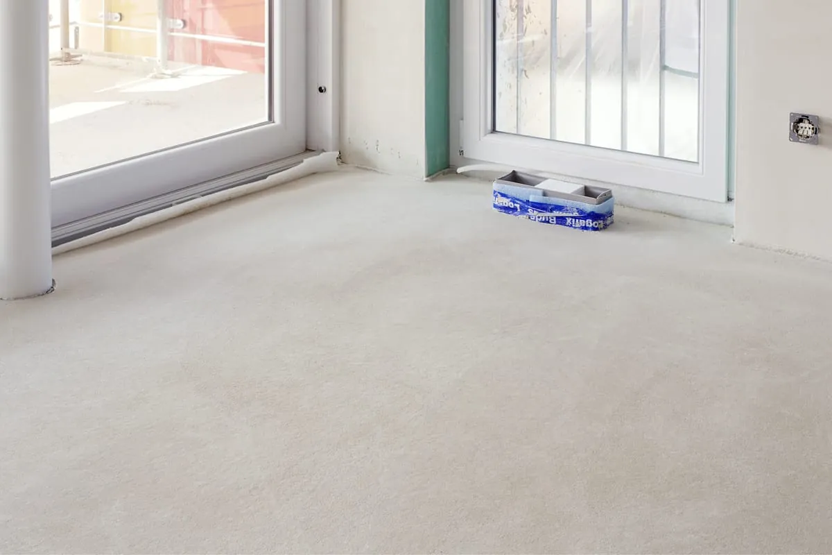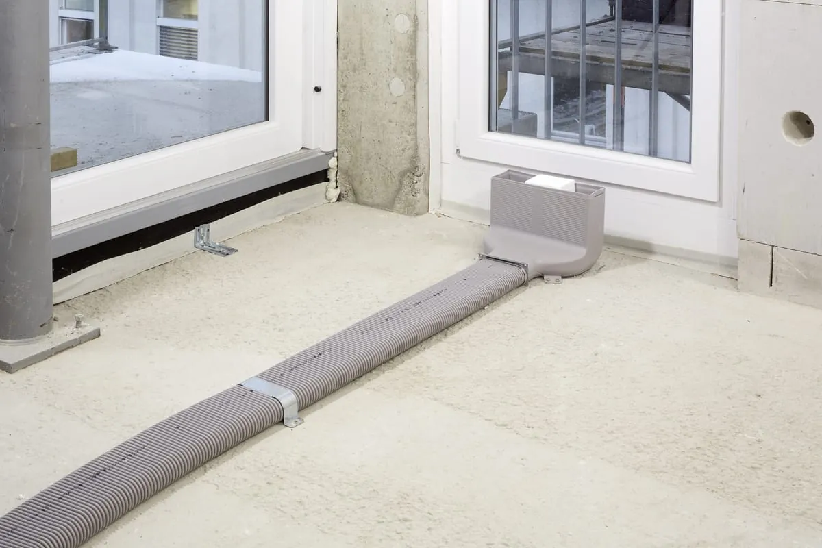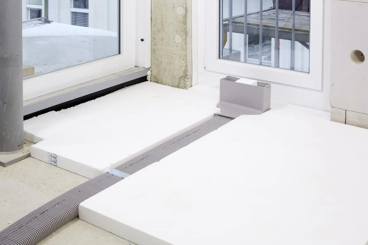 Im nächsten Schritt wird der Estrich gegossen. Hierbei ist der bauseitig eingesetzte Randdämmstreifen um das Luftdurchlassgehäuse notwendig, um eine Schallentkopplung des Gehäuses zu erreichen. Gleichzeitig wird dadurch bei schwimmenden Estrichsystemen für einen Dehnungsausgleich gesorgt.