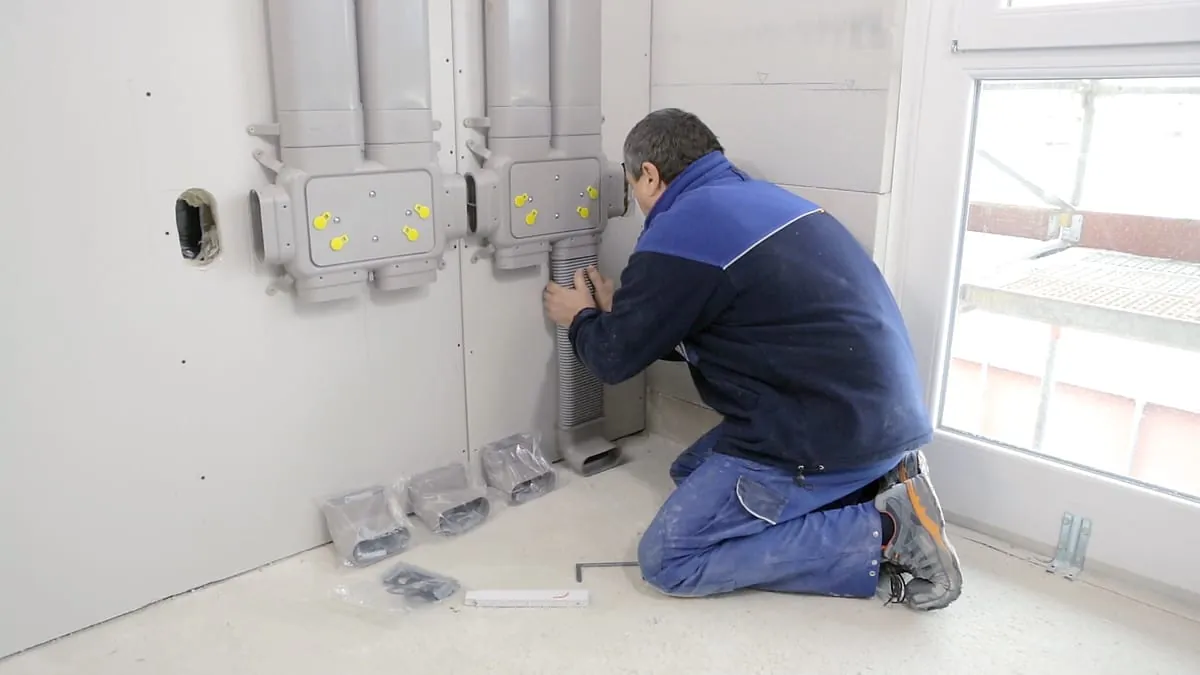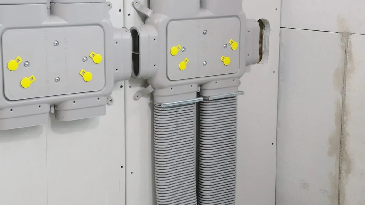 Die Verteiler führen die einzelnen Lüftungsleitungen der unterschiedlichen Räume zusammen. Es ist jeweils ein Verteiler für die Zuluft und ein Verteiler für die Abluft installiert. Der flache Aufbau der Verteilerkästen mit 70 mm Tiefe erlaubt dabei nahezu überall den besonders platzsparenden Einsatz. Im Beispielfall (links im Bild) wird die Installation anschließend mit einer Trockenbauwand verkleidet, ohne die Wohnfläche zu verkleinern.