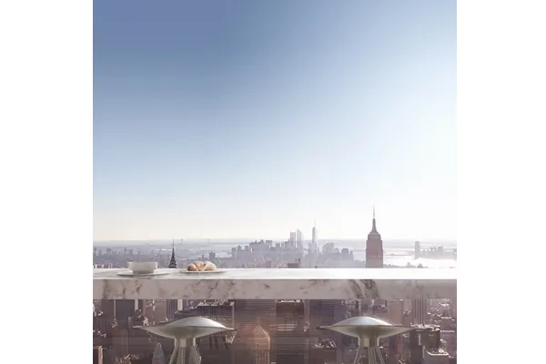 Die zukünftigen Bewohner erwartet ein völlig neues Lebensgefühl über den Wolken – dank großzügig dimensionierter Fenster von drei mal drei Metern und einer Ausstattung, die keine Wünsche offen lässt. Jedes Element wurde von Designerin Deborah Berke unter besonderer Berücksichtigung der außergewöhnlichen Architektur sorgfältig ausgewählt. So wurde auch in den Badezimmern nichts dem Zufall überlassen: Von der freistehenden Badewanne aus genießt man eine atemberaubende Aussicht, umgeben von edlem Marmor und puristischem Design. Das Ambiente verbindet Modernität mit zeitloser Eleganz und führt auf diese Weise den ikonischen Anspruch des Bauwerks auch im Inneren fort.