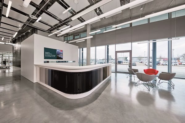 Der Markenerlebnisraum im Erdgeschoss des „Center of Climate“ stellt den kommunikativen Mittelpunkt des neuen Zehnder-Firmengebäudes am deutschen Standort in Lahr dar. Hier sollen das Motto „Pure Living – Gesundes Wohnen und Arbeiten mit Zehnder“ sowie die Lösungen und Produkte des Raumklimaspezialisten im Kontext ihrer jeweiligen Lebenswelten Form annehmen.