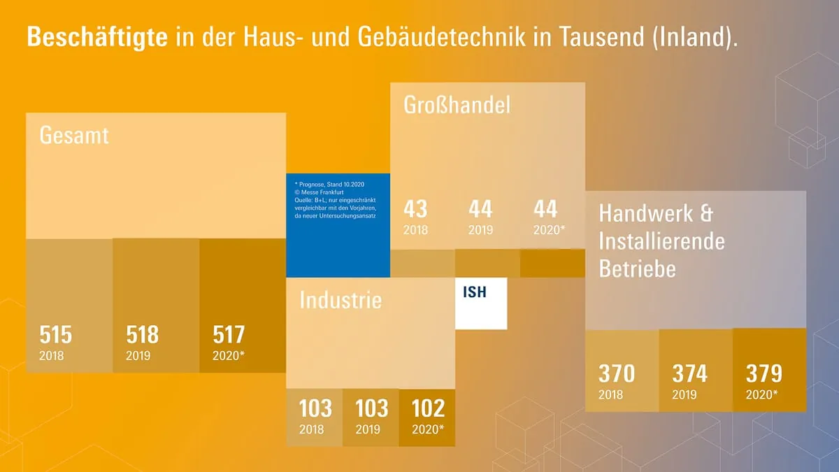 Die gesamte Branche der Haus- und Gebäudetechnik umfasst die Segmente Industrie, Handel und installierende Unternehmen. Insgesamt lassen sich dem Wirtschaftsbereich rund 49.000 Unternehmen zuordnen. Die Anzahl der Unternehmen ist seit dem Jahr 2016 rückläufig. Die Anzahl der Beschäftigten hingegen ist im Zeitverlauf leicht gestiegen und lag 2019 bei ca. 518.000 Personen. Die Umsätze in der gesamten Haus- und Gebäudetechnik lagen 2019 bei 60,9 Mrd. Euro und konnten somit um + 3,2 % im Vergleich zum Vorjahr gesteigert werden.