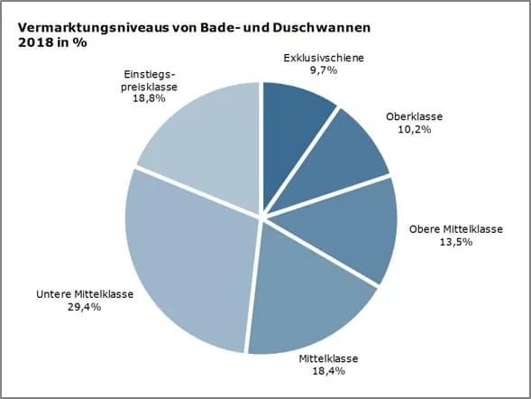 Der Umsatz mit Bade- und Duschwannen wird in sechs Vermarktungsniveaus zu Handelspreisen unterteilt. Die Einteilung der Vermarktungsniveaus basiert auf den preislichen Einschätzungen der in unserer Stichprobe befragten Handelsunternehmen: