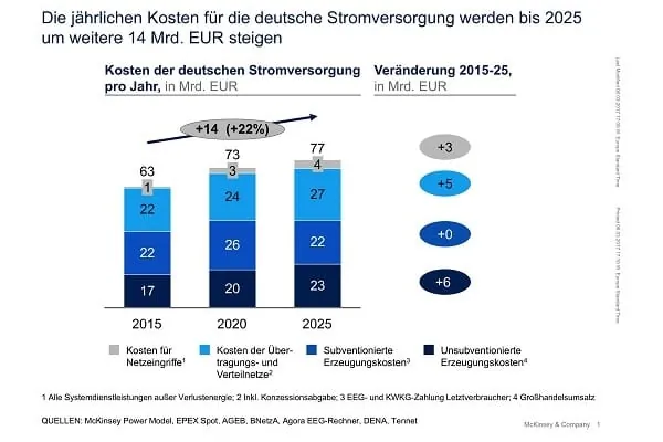 Zu den zentralen Kostentreibern der Energiewende zählen nach der Analyse von McKinsey vor allem der weitere Ausbau und die Förderung der erneuerbaren Energien und deren Subventionierung über die EEG-Umlage. „Hinzu kommen die steigenden Kosten für Netzausbau und Systemdienstleistungen, also die Ausgaben für Übertragungs- und Verteilnetze sowie für den Erhalt der Funktionstüchtigkeit aller Systeme“, sagt McKinsey-Seniorpartner Thomas Vahlenkamp. Der Anstieg der jährlichen Stromversorgungskosten von derzeit rund 63 auf 77 Milliarden Euro im Jahr 2025 entspräche einer Zusatzbelastung von durchschnittlich 335 Euro je Privathaushalt, sofern diese gleichmäßig auf alle Haushalte in Deutschland verteilt würden.