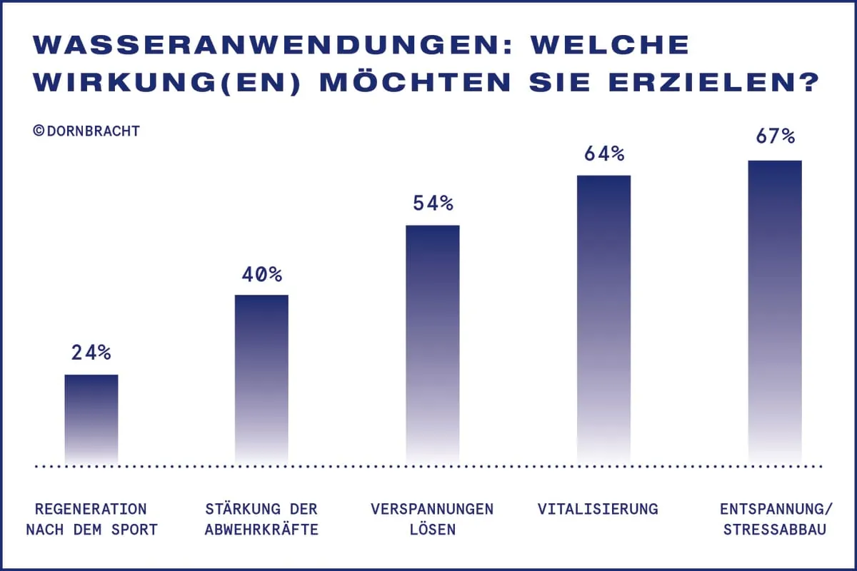 Was sind gewünschte Wirkung(en) von Wasseranwendungen? Auf diese Frage antwortete der Großteil der Befragten mit Entspannung/Stressabbau und Vitalisierung.