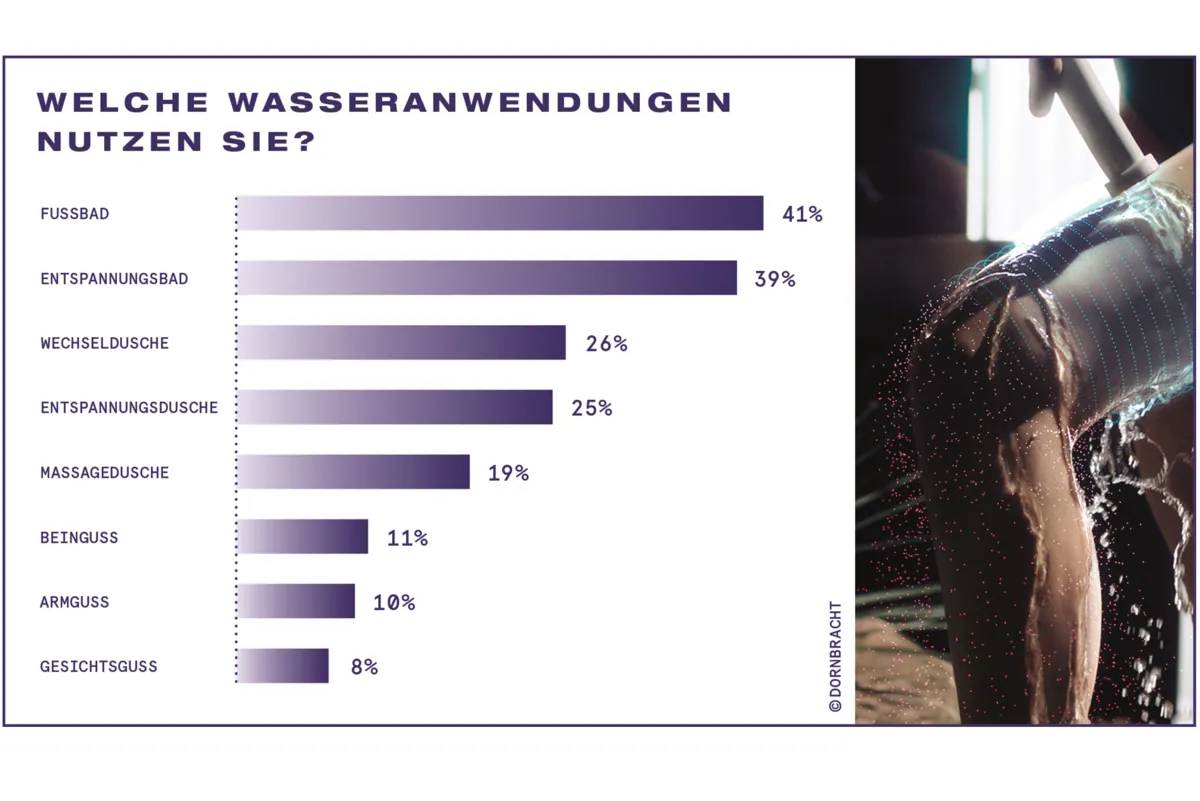Gesundheit ist die Motivationsquelle für Wellness- und Wasseranwendungen. Auf die Frage, welche Wasseranwendungen die Studienteilnehmer nutzen, antworteten 41 % mit Fußbad.