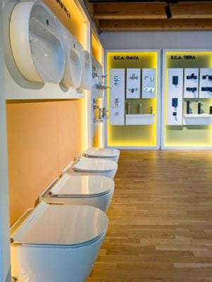 Wer sich ein Bild von den in Deutschland erhältlichen Produkten der E.C.A. verschaffen möchte, kann dies nun im neuen, lichtdurchfluteten Standort in Köln-Ossendorf tun. Neben stilvoll in Szene gesetzter Badkeramik und diversen Armatur-Serien findet man hier auch den Niedrigtemperatur-Heizkörper-Familie X-AIR sowie die Vertikalheizkörper-Serie. In der oberen Etage im Atelierstil findet man Ausstellungsstücke, von Gas-Brennwertgeräten bis Wärmepumpen. Außerdem können die Geräte live ausprobiert werden. Denn ein Konferenzraum wurde bereits mit der neuesten E.C.A.-Technologie ausgestattet.
