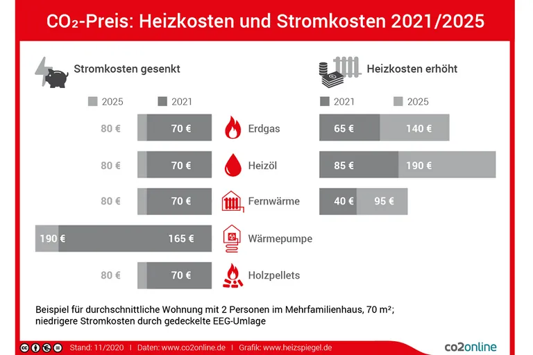 Auch das Heizen mit Wärmepumpen dürfte deutlich günstiger werden. Der Grund ist, dass die Einnahmen aus dem CO2-Preis die EEG-Umlage senken und Strom billiger machen sollen. Verbraucher mit Wärmepumpen zahlen 2021 in einem durchschnittlichen Einfamilienhaus schätzungsweise 240 Euro weniger für ihren gesamten Stromverbrauch als dieses Jahr. Im Jahr 2025 sind es voraussichtlich 275 Euro weniger.
