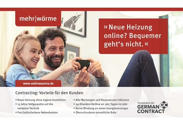 Mit der Plattform mehrwärme startet das Unternehmen nun einen neuen Vertriebsweg im Internet. „Wer auf der Suche nach einer modernen und effektiven und dennoch schnellen und komfortablen Lösung für eine neue Heizung ist, Aufwand und hohe Investitionskosten aber scheut, für den ist das digitale Vertriebsmodell von german contract genau das Richtige“, heißt es aus Neuss. Für ein Contractingangebot müssen sich Kunden lediglich durch einen kurzen Fragebogen klicken, der relevante Informationen über den aktuellen Stand der Energieversorgung, der gewünschten neuen Heizmethode, die Immobilie sowie die Kontaktdaten abfragt. Innerhalb von nur einer Minute soll der Kunde per E-Mail ein auf seine individuellen Bedürfnisse abgestimmtes Angebot erhalten, das die voraussichtliche Höhe seiner Heizungsmiete enthält. Direkt beim Kunden Zuhause erfolgt dann die persönliche Beratung vom lokal ansässigen Fachhandwerker. Nach Abschluss eines Contracting-Vertrages übernimmt dieser die Installation sowie die Wartungsarbeiten und eventuell anfallende Reparaturen. Der Kunde erhält nach Unternehmensangaben „eine Heizungsanlage, die technisch auf dem neuesten Stand ist und muss sich für die Dauer der Vertragslaufzeit um seine Wärmeversorgung keinerlei Gedanken mehr machen“. Denn german contract übernimmt für 15 Jahre die Garantie für die verbaute Technik.