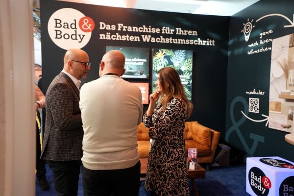 Messestand zum Franchise Bad & Body mit drei Besuchern im Gespräch.