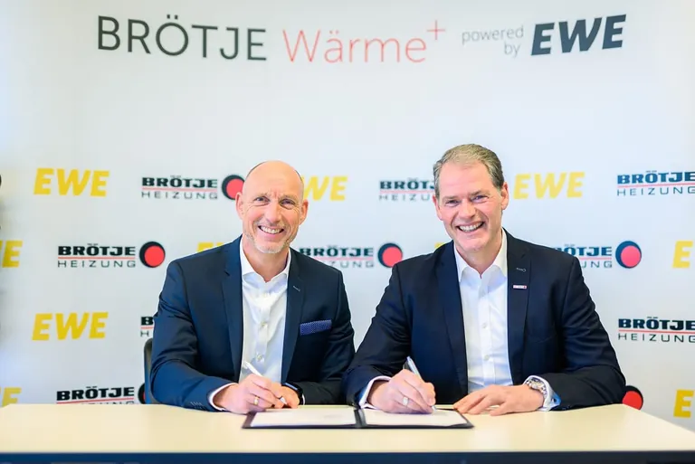 In Kooperation mit dem Oldenburger Energiedienstleister EWE hat der Heizungshersteller August Brötje GmbH ein deutschlandweites Angebot für Eigenheimbesitzer entwickelt. Damit können diese künftig von Brötje ein Heizungskomplettpaket mieten. Den Startschuss für die Vermarktung von „Brötje Wärme+ powered by EWE “ gaben dazu mit der Unterzeichnung des Kooperationsvertrages Heinz-Werner Schmidt, Geschäftsführer der August Brötje GmbH, und Michael Heidkamp, Vorstand Markt der EWE AG