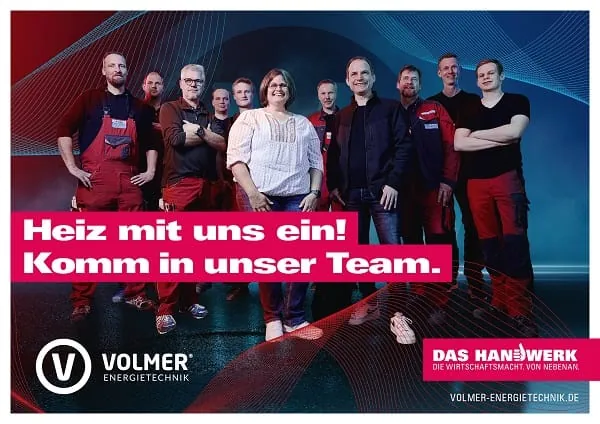 Wenn die Firma Volmer Energietechnik im Juni mit Großflächenplakaten rund um den Betriebsstandort in Billerbeck um neue Mitarbeiter wirbt, dann geschieht dies im Design der bundesweiten Imagekampagne des Handwerks. Auch der SHK-Betrieb Karl Becker Haustechnik aus Brilon präsentiert sich den Kunden und potenziellen neuen Mitarbeitern in seiner Region auf Plakatwänden mit überzeugendem Teamfoto und selbstbewusster Botschaft als Teil der „Wirtschaftsmacht von nebenan“.