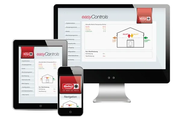 Dank der neuen KWL-Steuerung easyControls ist die Bedienung der Helios KWL-Systeme so einfach wie noch nie. Der integrierte Webserver erlaubt das einfache Einbinden der Lüftungsanlage in das Heimnetzwerk und bietet die Möglichkeit, das KWL-Gerät über eine intuitive Bedienoberfläche im Webbrowser per PC, Tablet oder Smartphone zu steuern. Zusätzlich ermöglicht das Webportal registrierten Nutzern Gerätedaten von unterwegs abzufragen und zu verändern.
