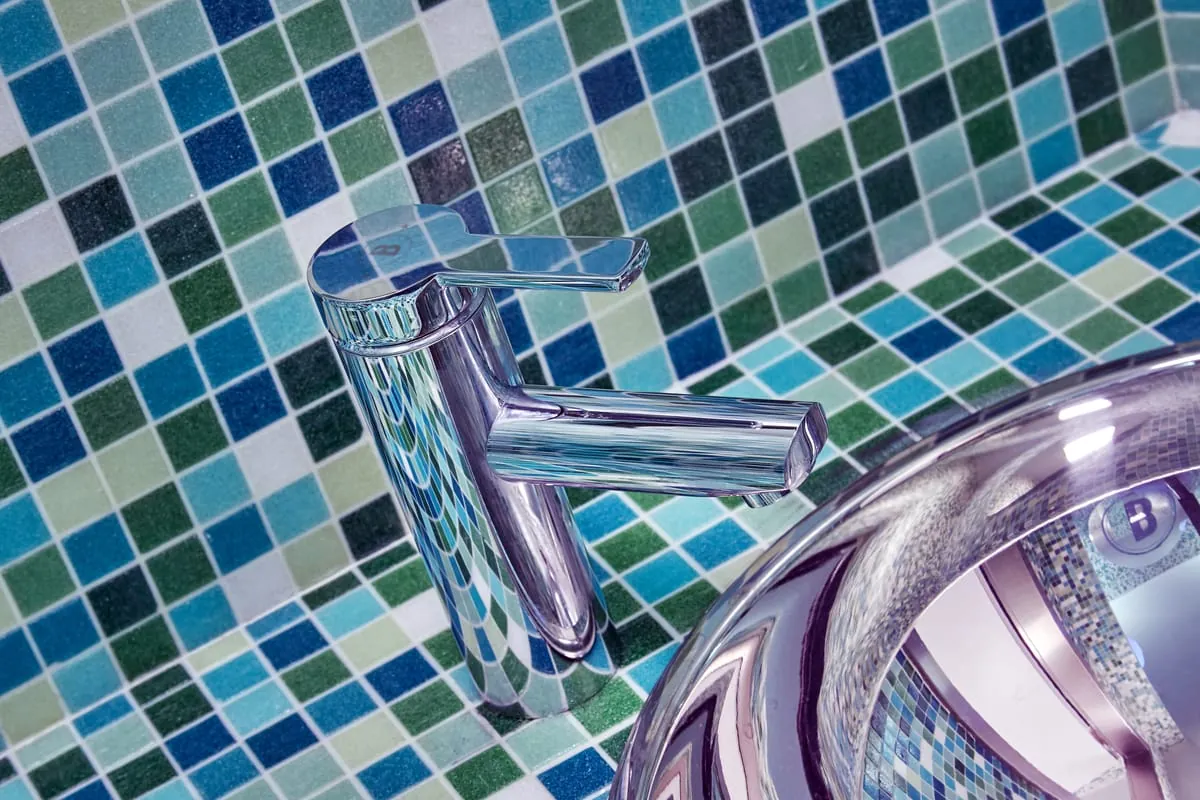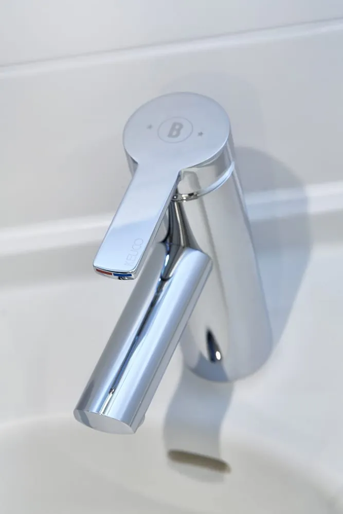 Das Brucklyn-Logo auf den Keuco Plan blue Armaturen am Waschtisch …