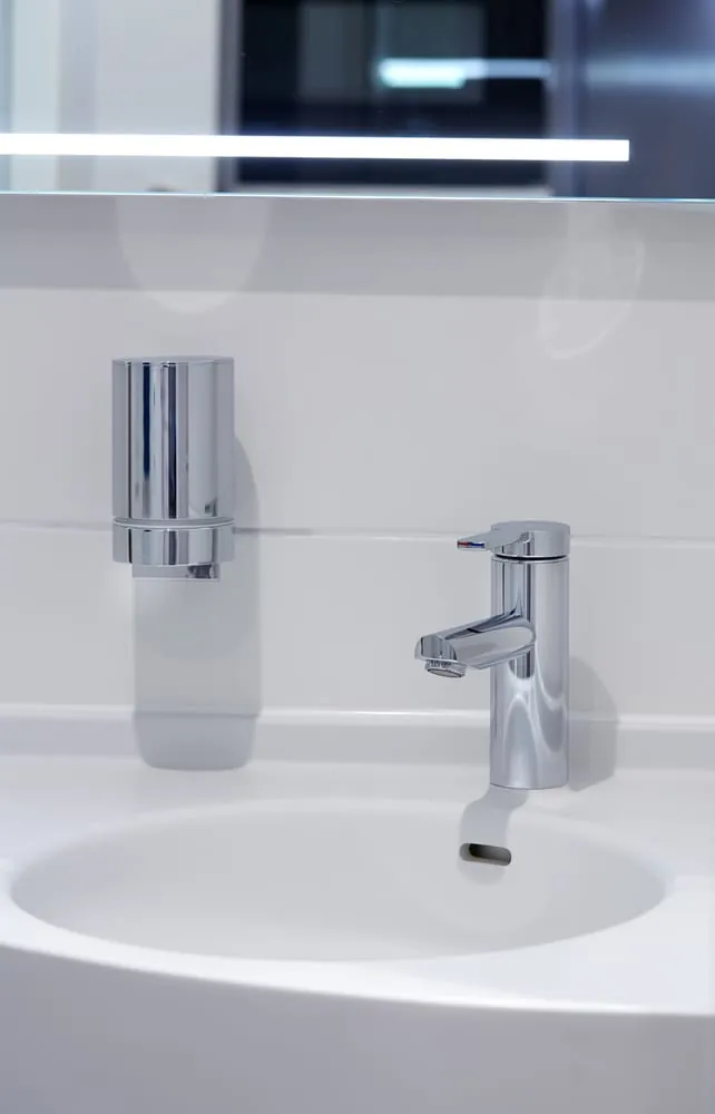 Schlicht und designstark kommen die verchromten Oberflächen der Armaturen und Accessoires am Waschtisch …