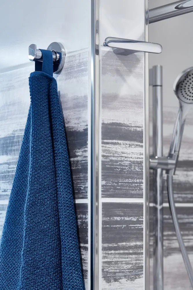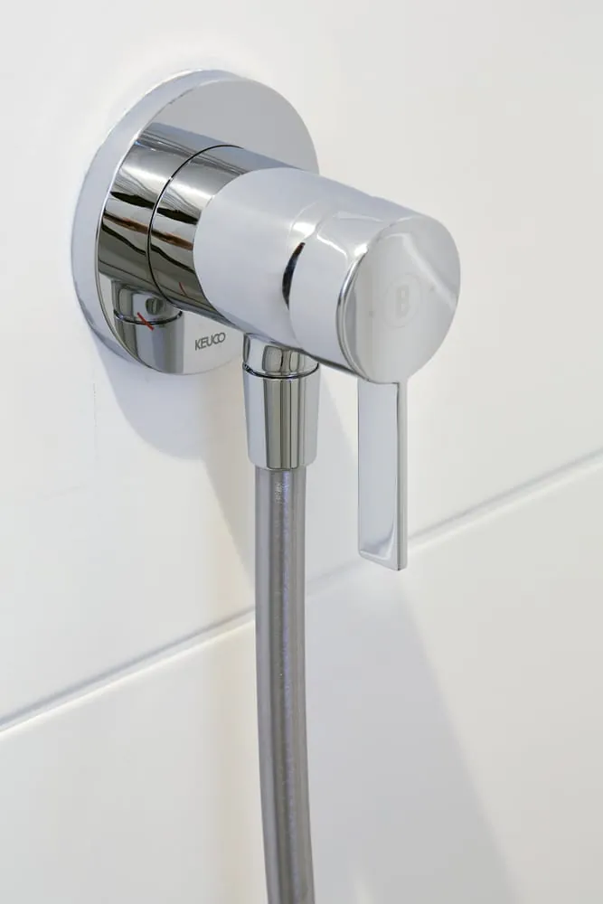 In der Dusche wurde Ixmo_solo eingesetzt. Die Duscharmatur, die Einhebelmischer und Schlauchanschluss in einem Modul vereint. Ganz nach dem Prinzip „weniger kann mehr“.
